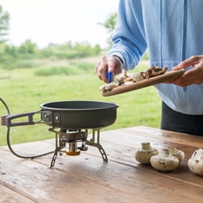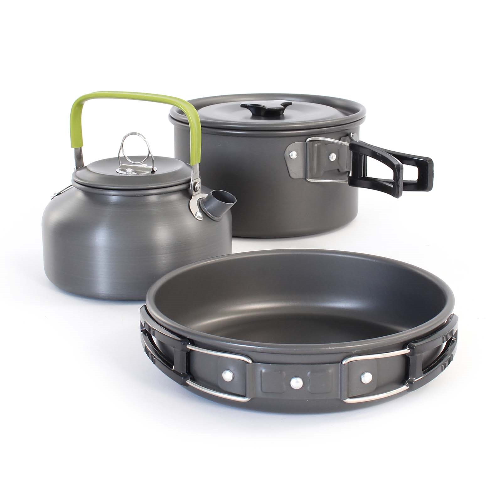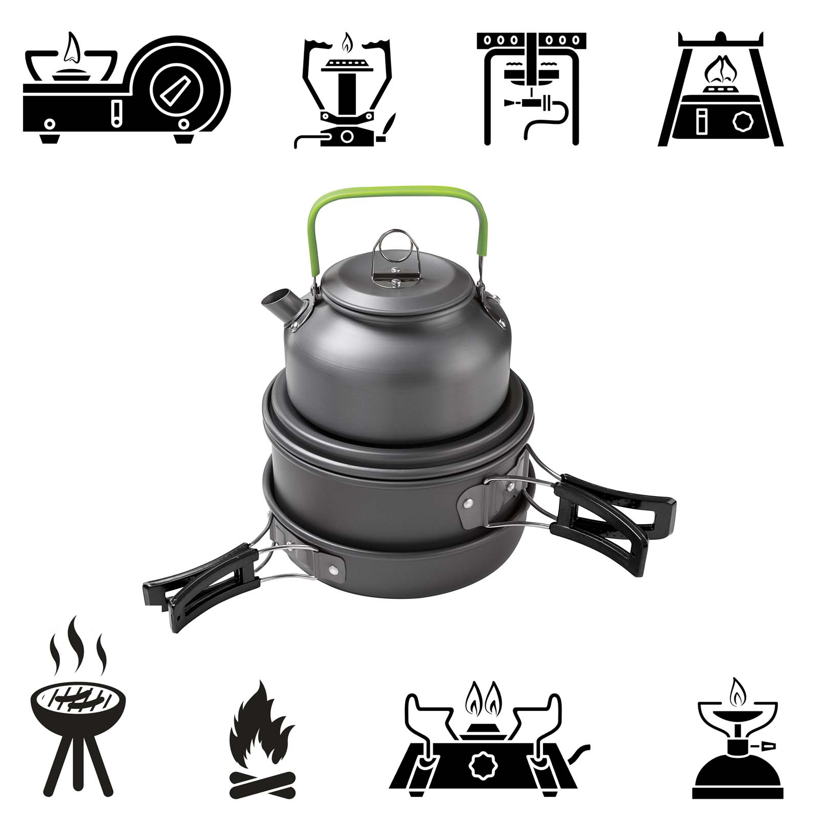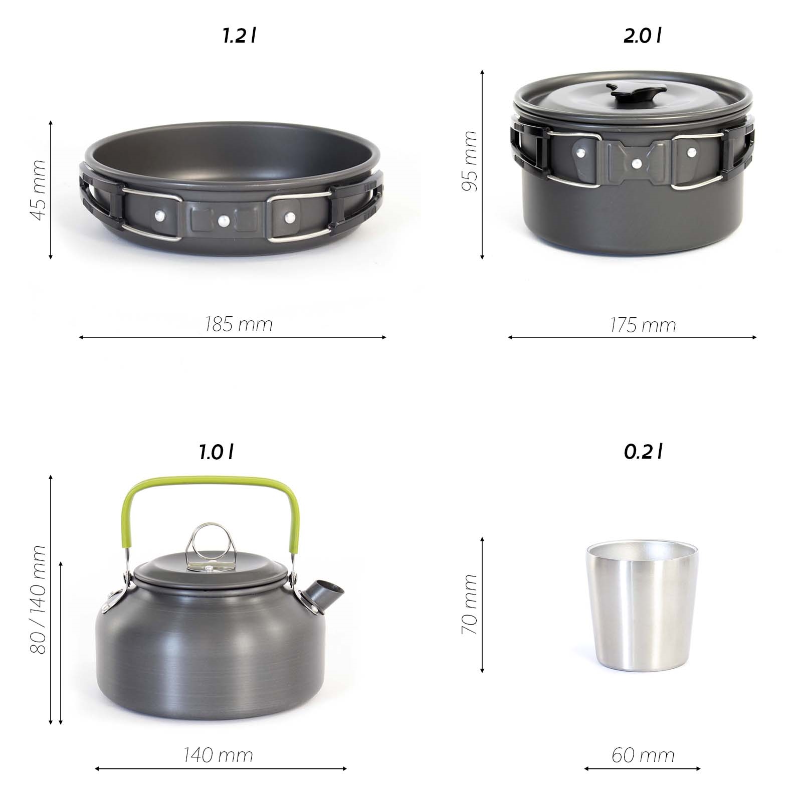 Dette komplette grydesæt giver dig alt nødvendigt til både daglig madlavning hjemme og campingture. Sættet transporteres nemt i en bæretaske med karabinhage, så alle dele holdes samlet og beskyttede. Med en 2,0 liters gryde og en 0,8 liters kedel kan du tilberede måltider til to personer, mens det skrue-på-komfur med justerbar flammekontrol giver fleksibilitet til madlavning forskellige steder.