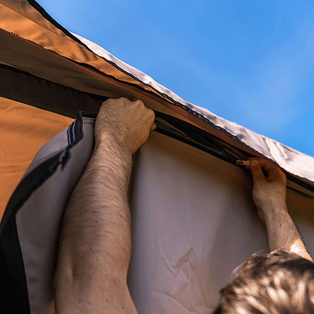 Dette sidesæt til dit Texel solsejl skaber et beskyttet opholdsrum, der blokerer for det meste af vinden – afgørende når du skal have komfort under blæsende campingforhold. Sidepanelerne er vandtætte, så du kan fortsætte med at bruge dit udendørsområde selv i regnvejr, og dit campingudstyr forbliver tørt. Lynlåssystemet gør opsætning og nedtagning hurtig, hvilket er praktisk, når du skifter campingplads. Hvert panel har et cirkulært vindue, der sikrer lys og udsyn.