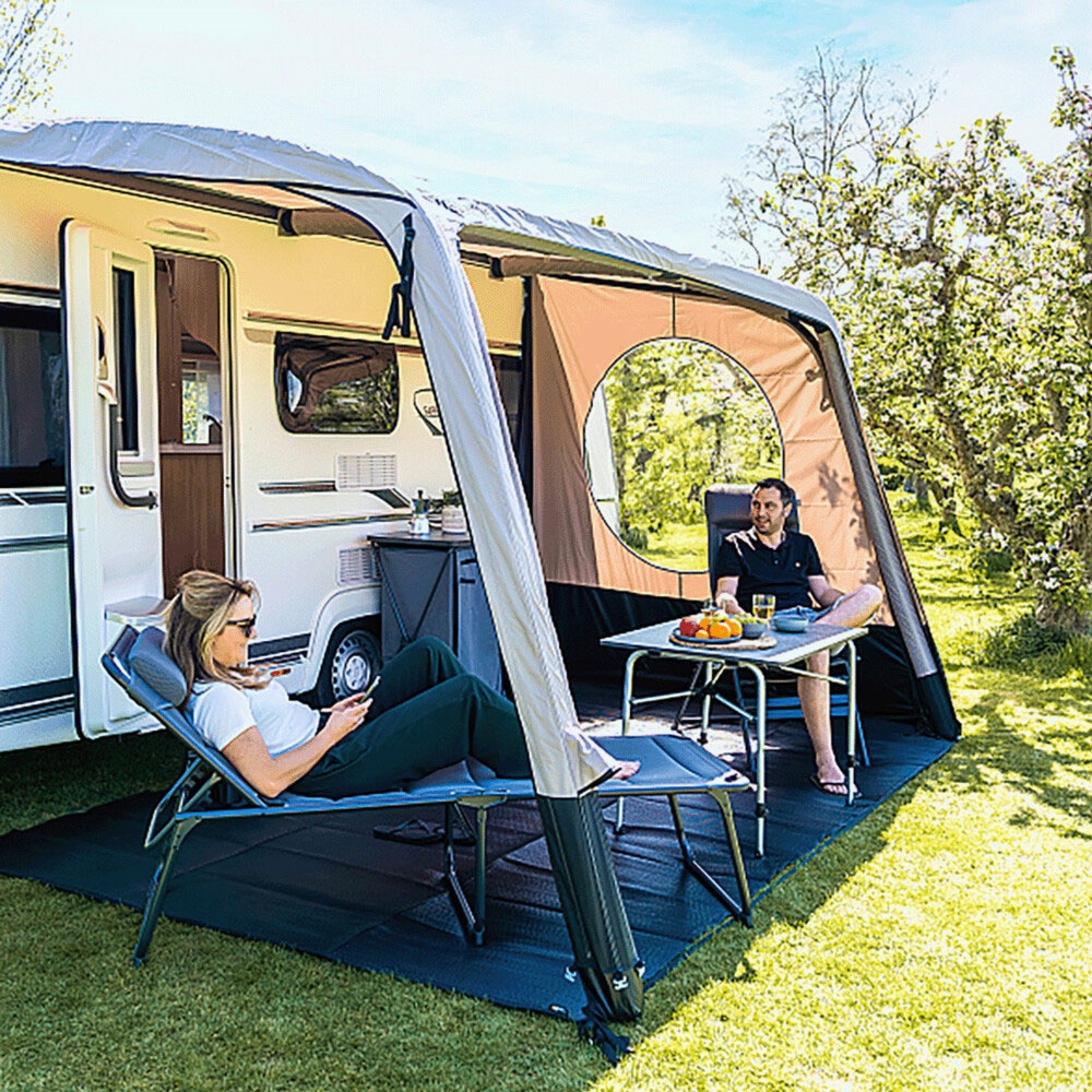 Sidepanelerne vejer samlet 4,64 kg, hvilket gør dem håndterbare at transportere mellem campingture. Polyestermaterialet er vejrbestandigt og hurtigtørrende efter regn, så du ikke skal vente længe, før næste brug. Det cirkulære vindue i hvert panel giver naturligt lys uden at kompromittere beskyttelsen mod vind og vejr. Beige og sorte farver passer til de fleste campingvogne.