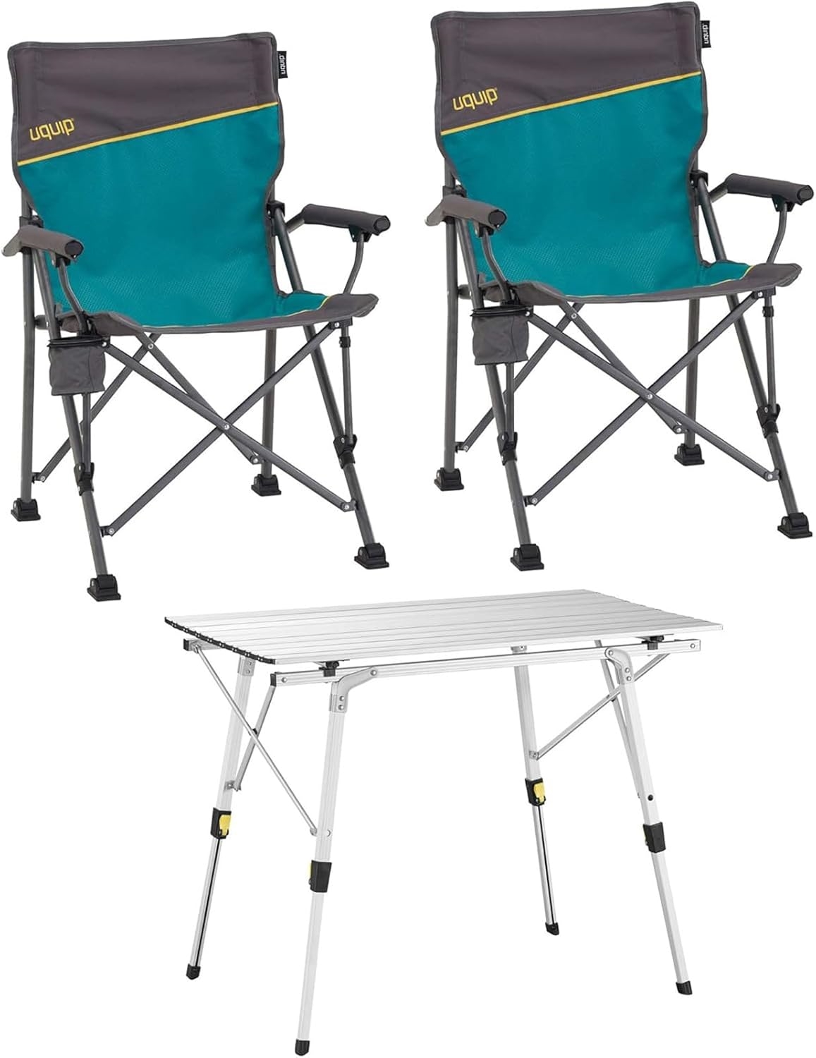 UQUIP Bloody Rejse set kombinerer to foldestole og et bord i et pladsbesparende design, ideelt til camping og udendørs aktiviteter. Med kompakte pakkestørrelser på 96 x 22 cm for stolene og 91 x 15 cm for bordet, forbedrer dette sæt din udendørs aktivitet med en kombination af funktionalitet og holdbarhed.