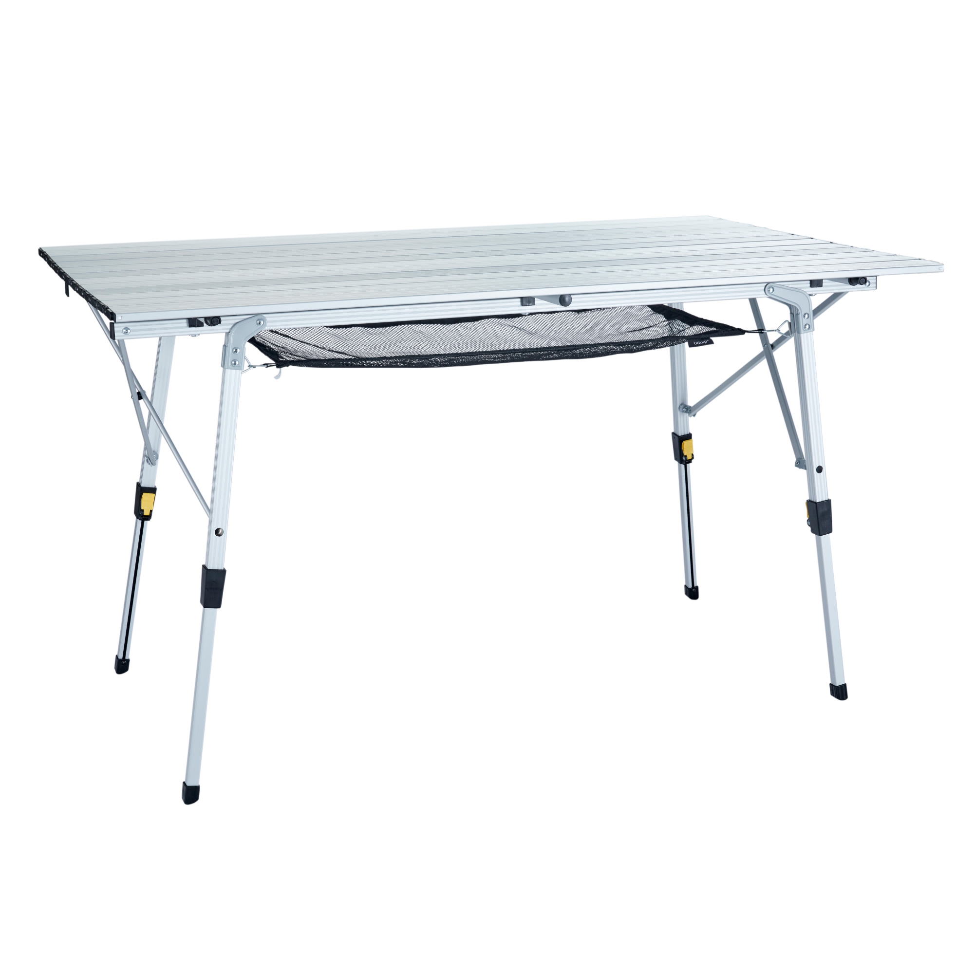 Campingbord med rulletop, justerbare ben og netopbevaring under bordpladen.