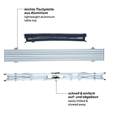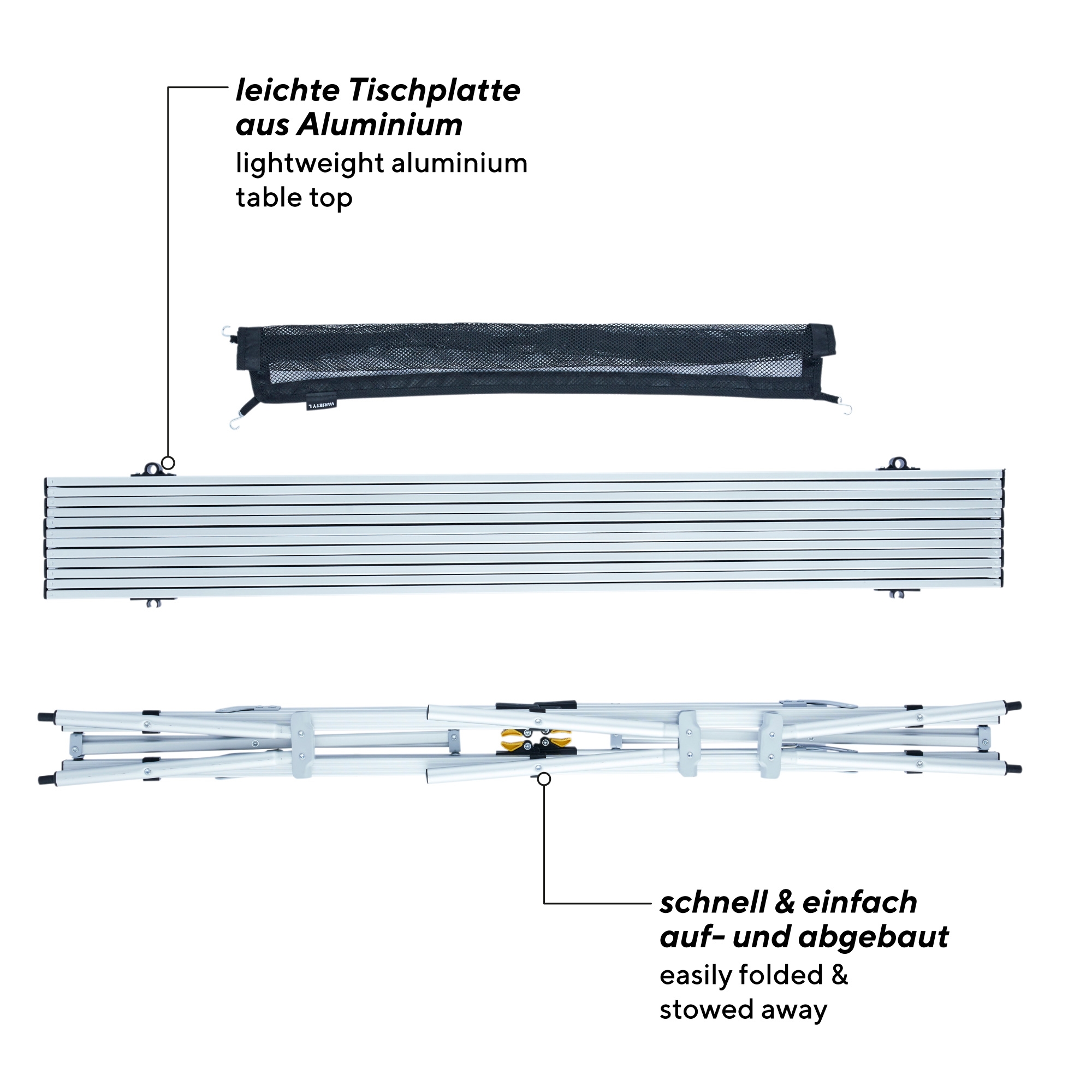 De individuelt justerbare ben og den lette aluminiumsramme giver stabilitet på ujævne overflader og letter transport og opsætning. Et integreret opbevaringsnet under bordpladen tilbyder praktisk opbevaringsplads til mindre genstande, hvilket kan øge bordets funktionalitet.