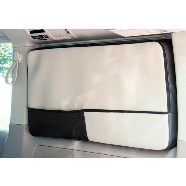 Vinduetaske med rum, lynlås, netlomme og lukkede lommer til VW T5/T6, fastgjort til bilens interiør.