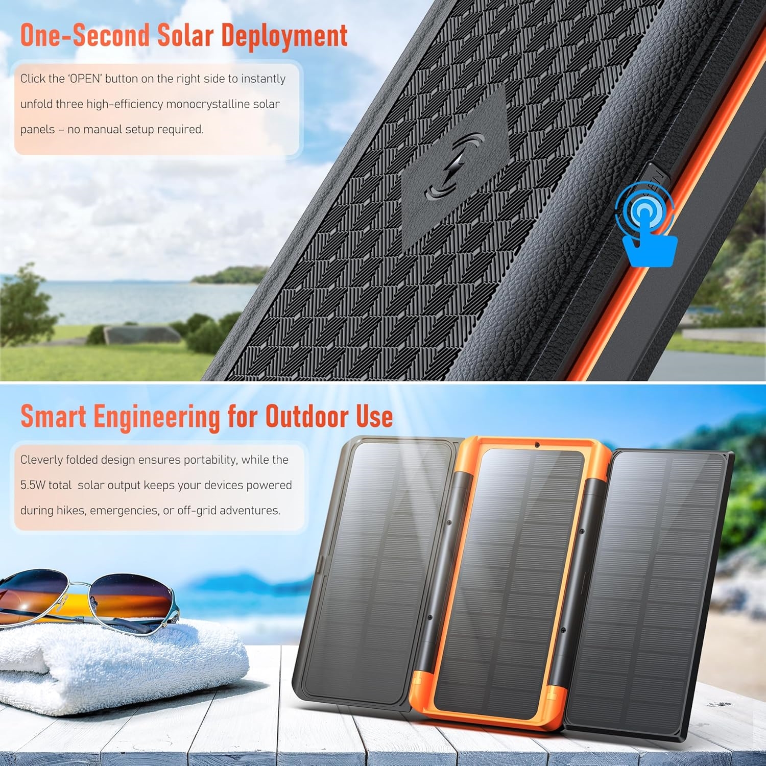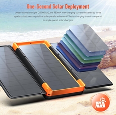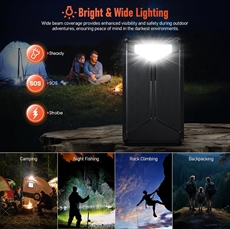 Powerbanken sikrer langvarig strømforsyning i dagevis, når du ikke har adgang til elnettet. Solpanelerne gør dig uafhængig af traditionelle strømkilder i naturen. LED-nødlyset giver tryghed i mørke omgivelser med tre indstillinger: SOS, stroboskop og kontinuerligt lys. Trådløs opladning på op til 15 W gør det nemt at holde enheder opladet uden kabler i trange rum.