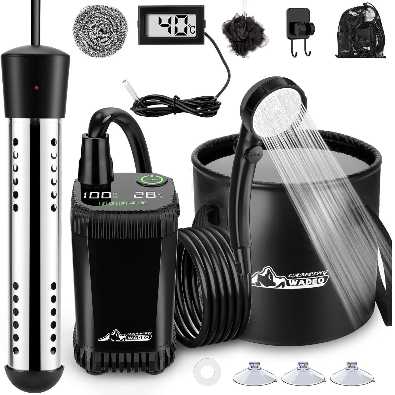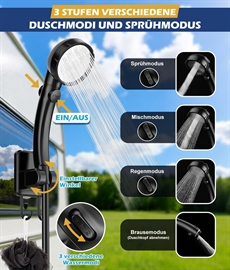 Denne campingbruser kombinerer en dykpumpe, massageduschhoved, foldbar 20-liters spand og vandvarmer i én kompakt løsning. Den automatiske termostat slukker ved 70 °C og tænder igen ved 40 °C, så du får varmt vand uden konstant overvågning – ideel når du camperer i naturen. Med 5 justerbare gennemstrømningsmodi får du kontrol over vandforbruget: modus 1 giver 140 minutters driftstid, mens modus 5 giver 80 minutter.