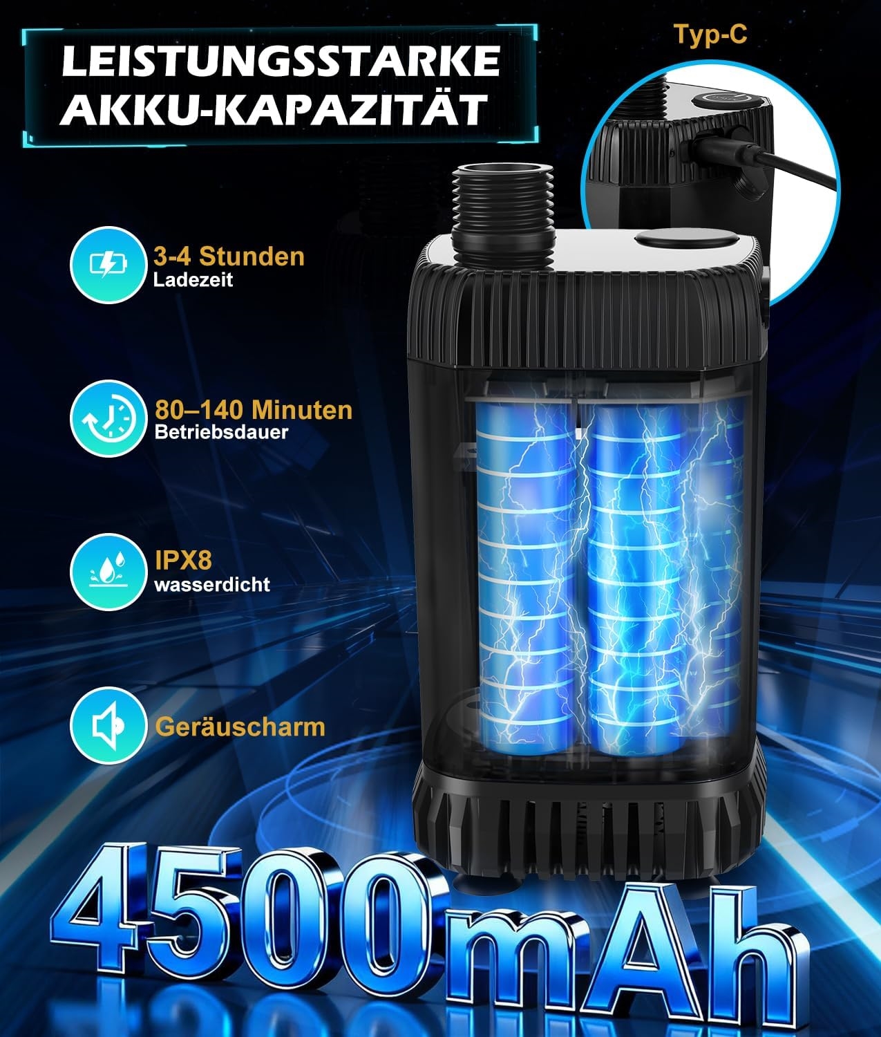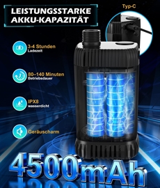• Opladningstid vandpumpe: 3-4 timer med 5V/2A-oplader
