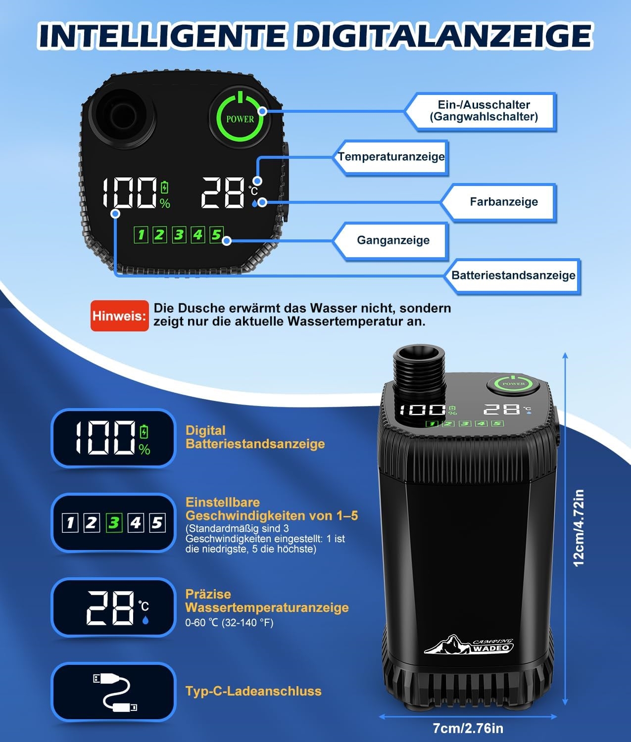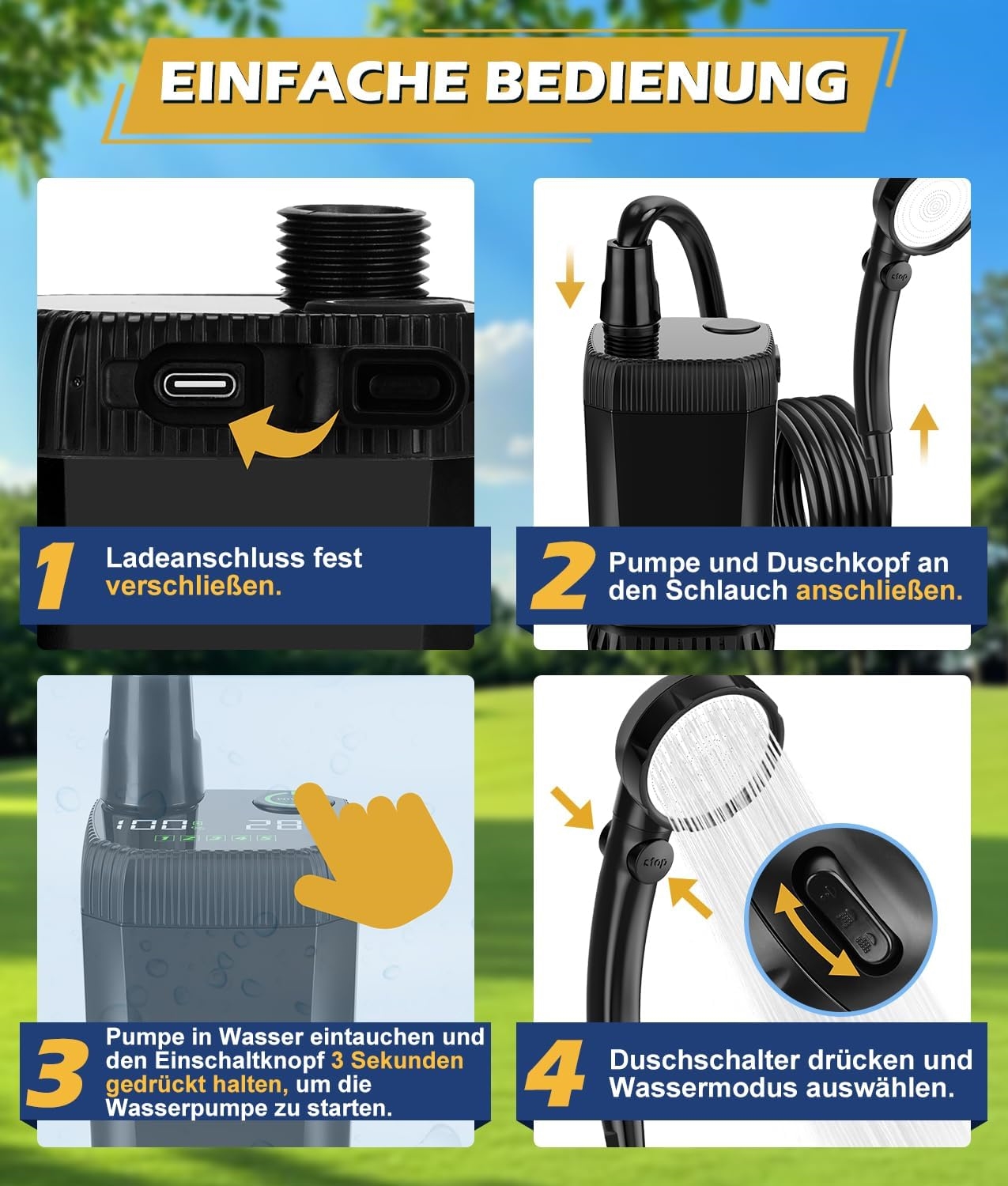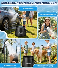 • Inkluderet i pakken: Dykpumpe, duschhoved, foldbar spand, oplader, monteringskrog