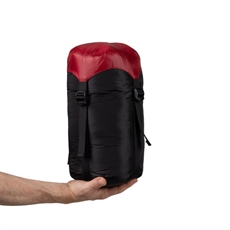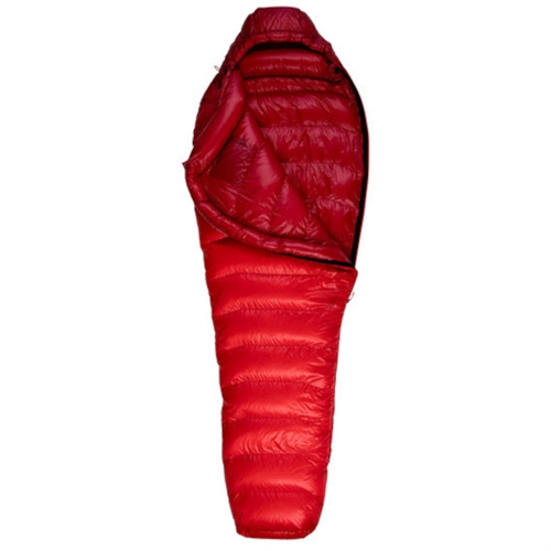 Rød mumieformet sovepose med hætte og lynlås på siden, ideel til udendørs brug.