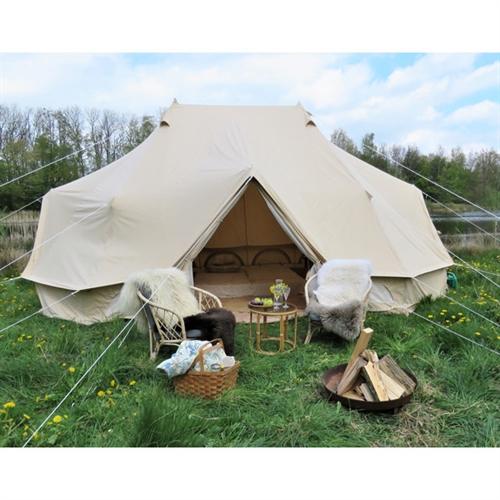 Stort glamping-telt med 24 m² indendørsareal og plads til 16 personer. Teltet giver mulighed for brug i forskellige sæsoner med mulighed for installation af brændeovn, hvilket kan forlænge anvendelsesperioden betydeligt.